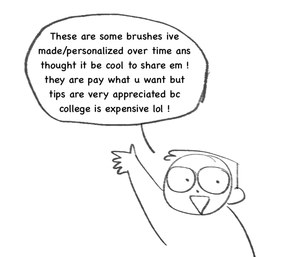free brushes ive made/personalized over time for procreate. The examples were drawn based on how i used them but go crazy w em ! hope yall like em :^)